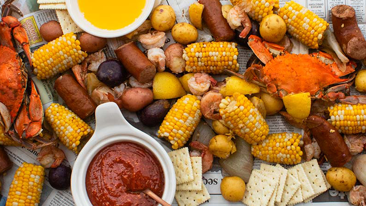 Sausage, shrimp, corn on the cob, potatoes, and carrots all boiled together in a pot